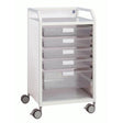 Tall, standard width trolley with 4 wide shallow trays and 1 wide deep tray (replacement spare trays available to order).