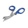 Heavy Duty Tough Cut Scissors. One serrated and one hard cutting edge. Blue Handles. Stainless Steel.